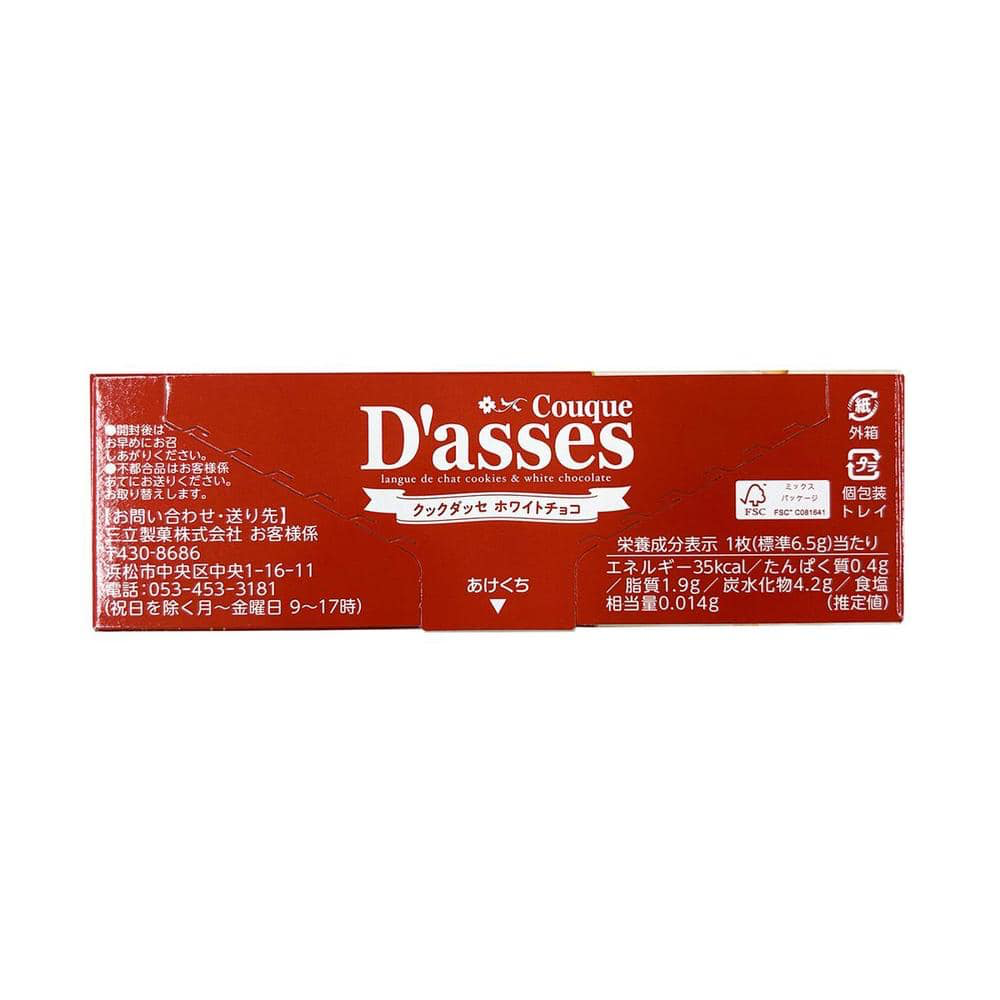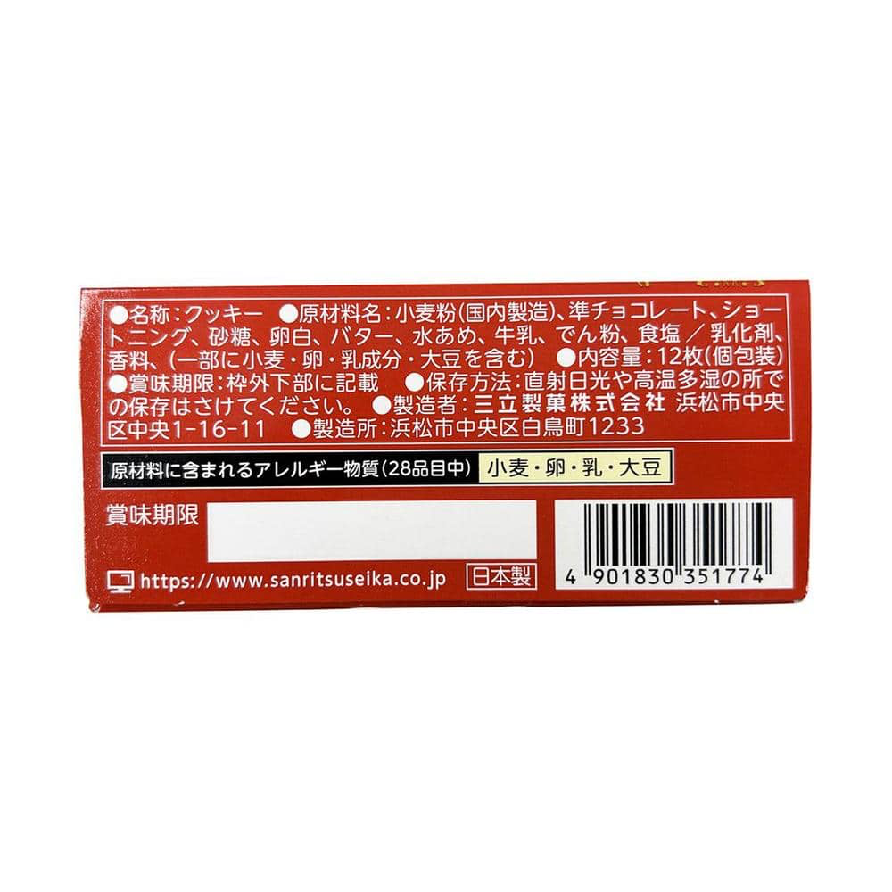 Ingredients: Wheat flour (domestically produced), semi-sweet chocolate, shortening, sugar, egg white, butter, glucose syrup, milk, starch, salt, emulsifier, flavoring, (contains wheat, egg, milk, soy)
