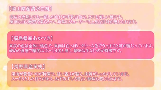 **The Promise of the Peach Region:** As the product name suggests, this product is dedicated to preserving the peach flavor of Japan's famous peach-growing regions. Enjoy the pure peach flavor and experience the unique charm of the variety and origin.